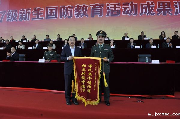 国防教育成果汇报大会上,党委书记吴学敏代表学校向解放军陆军工程大学指挥军官基础教育学院贾卫主任赠送了“军民鱼水情意深,壮志共筑中国梦”的锦旗,感谢解放军陆军工程大学指挥军官基础教育学院对我校的大力支持。党委委员、副校长苏小冬宣读了军训先进集体和个人的表彰决定。学校领导和嘉宾为获奖的“军训先进连队”、“优秀教官”、“优秀教导员”等集体和个人代表颁奖。