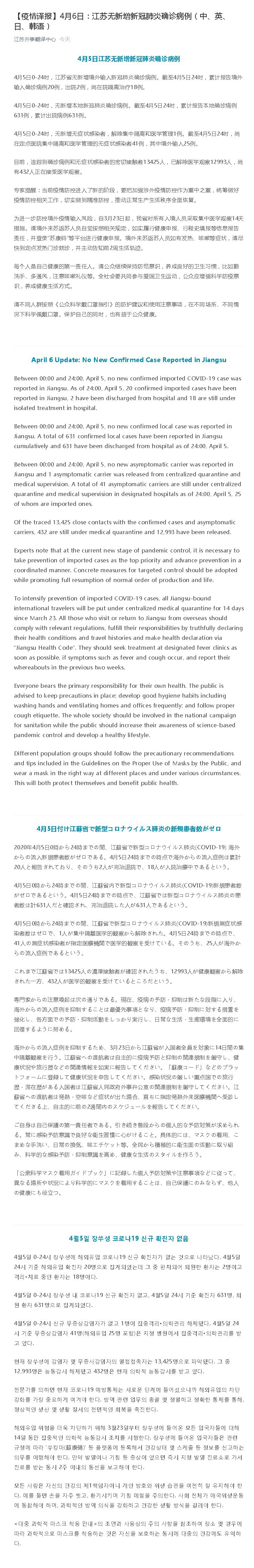 April 6 Update: No New Confirmed Case Reported in Jiangsu