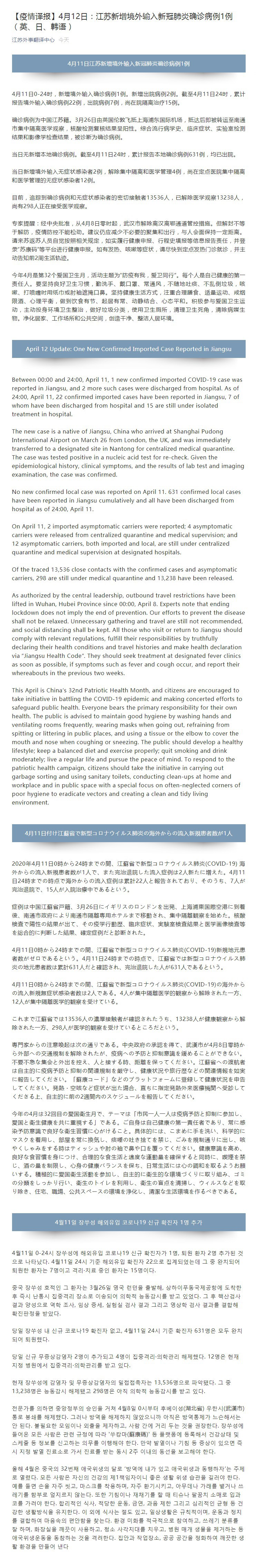 April 12 Update: One New Confirmed Imported Case Reported in Jiangsu