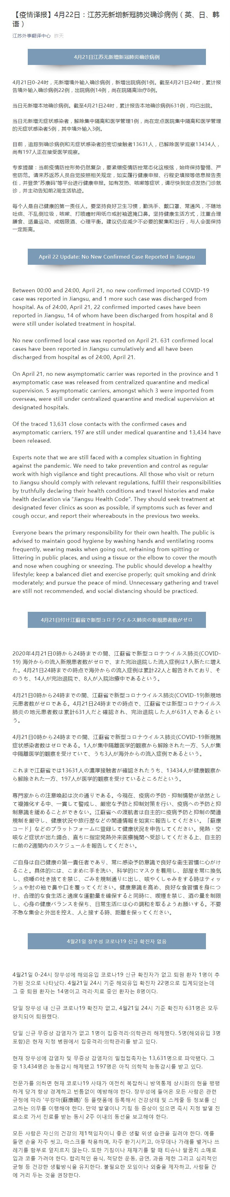 April 22 Update: No New Confirmed Case Reported in Jiangsu