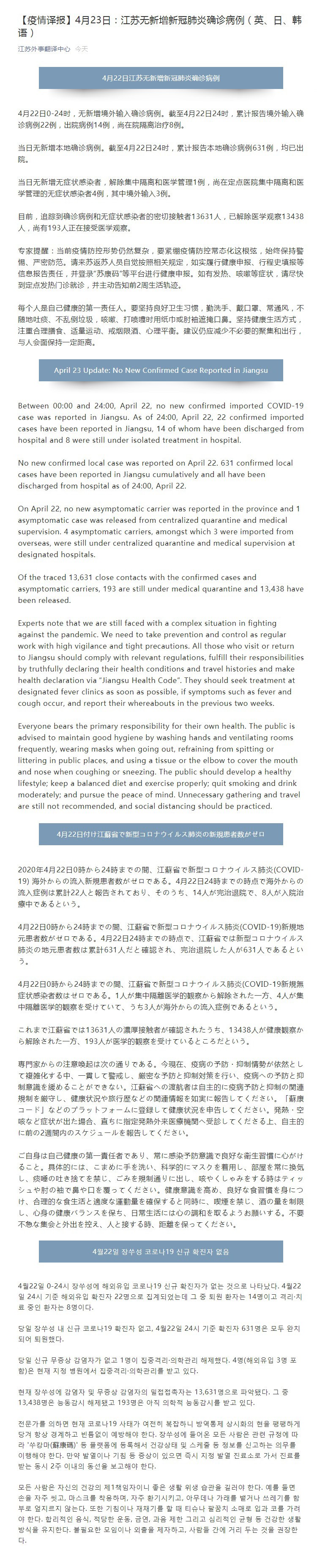 April 23 Update: No New Confirmed Case Reported in Jiangsu