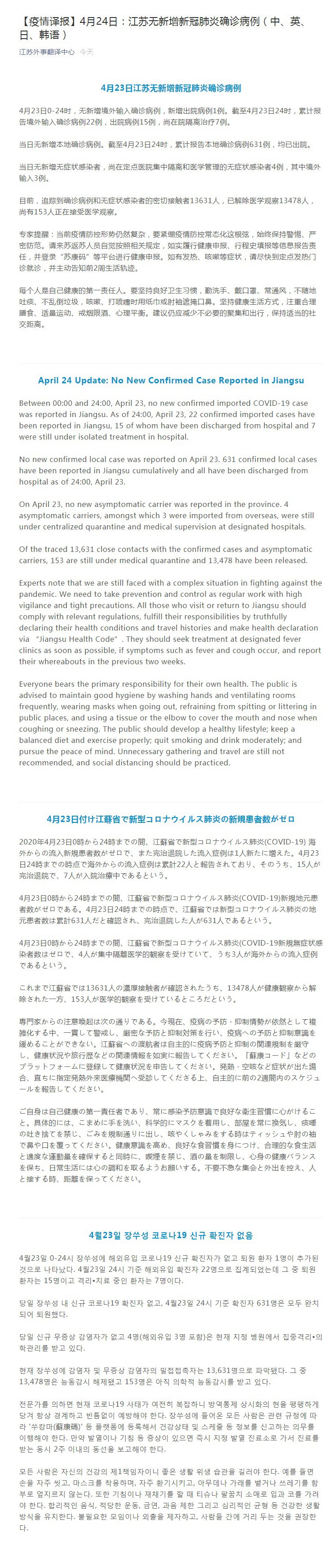 April 24 Update: No New Confirmed Case Reported in Jiangsu