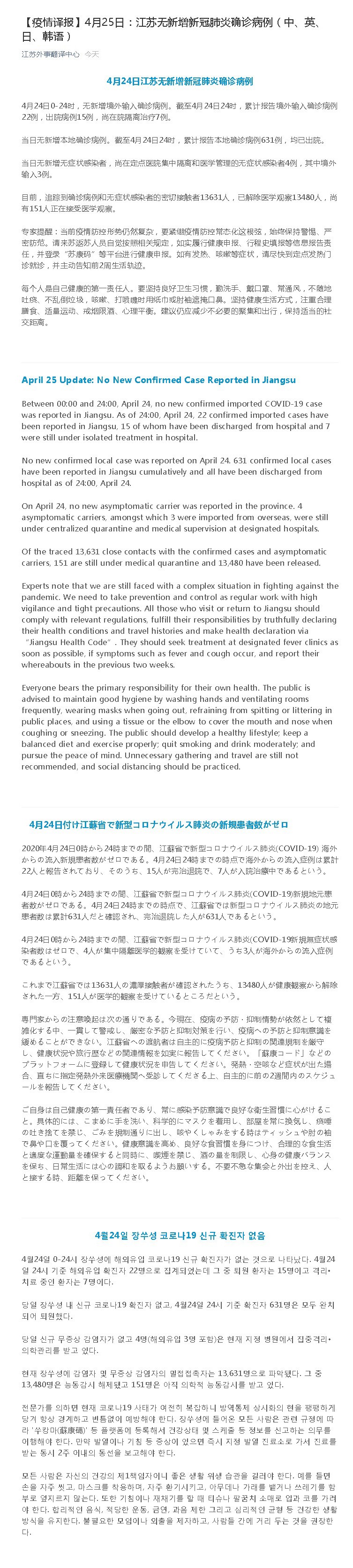April 25 Update: No New Confirmed Case Reported in Jiangsu