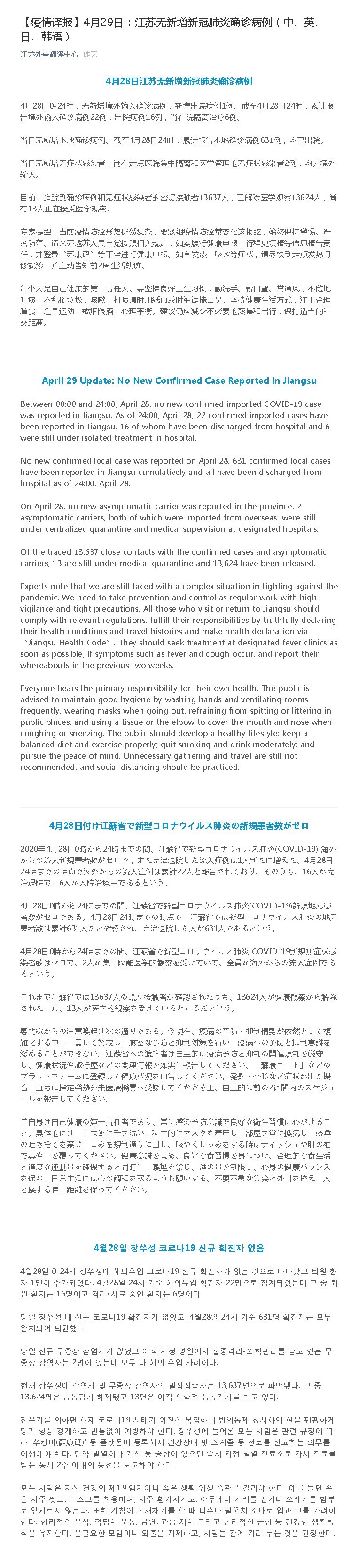 April 29 Update: No New Confirmed Case Reported in Jiangsu
