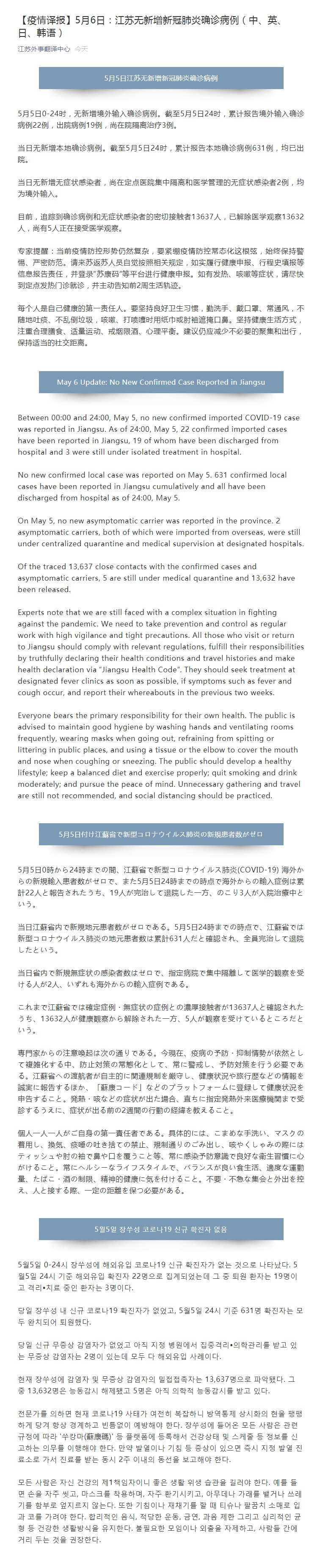 May 6 Update: No New Confirmed Case Reported in Jiangsu
