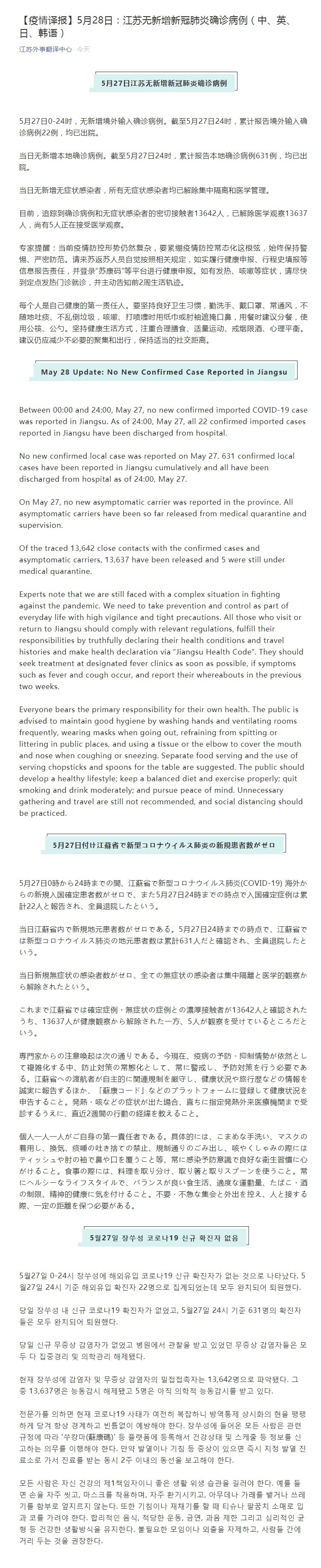 May 28 Update: No New Confirmed Case Reported in Jiangsu