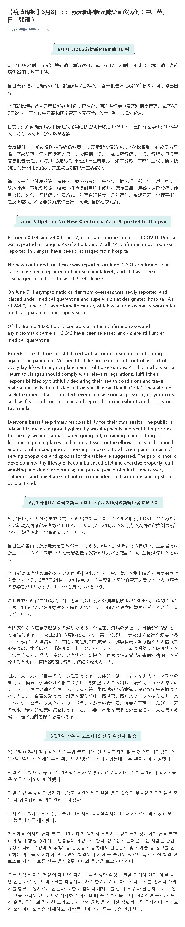 June 8 Update: No New Confirmed Case Reported in Jiangsu