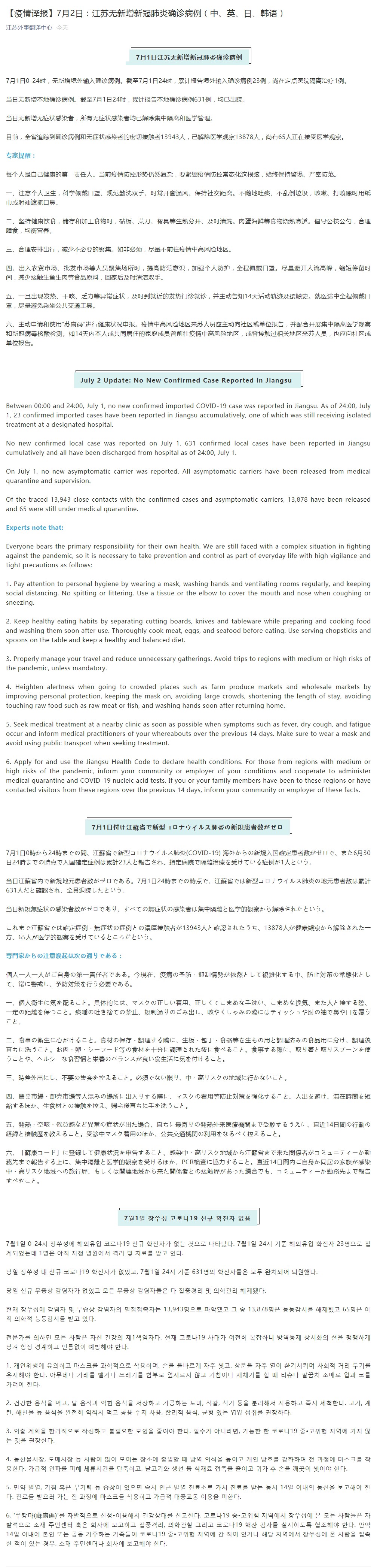July 2 Update: No New Confirmed Case Reported in Jiangsu