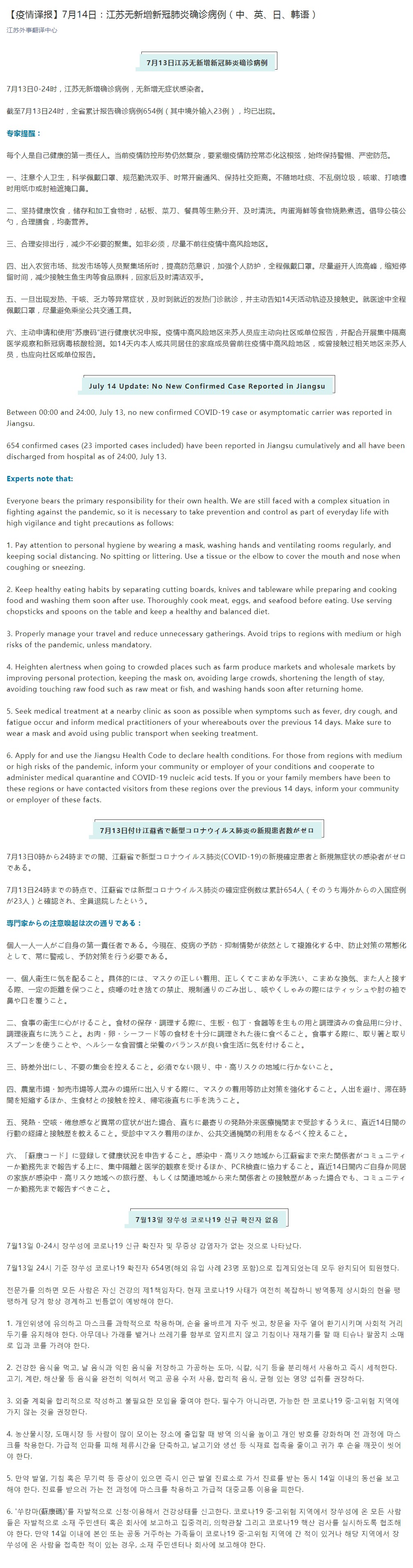 July 14 Update: No New Confirmed Case Reported in Jiangsu
