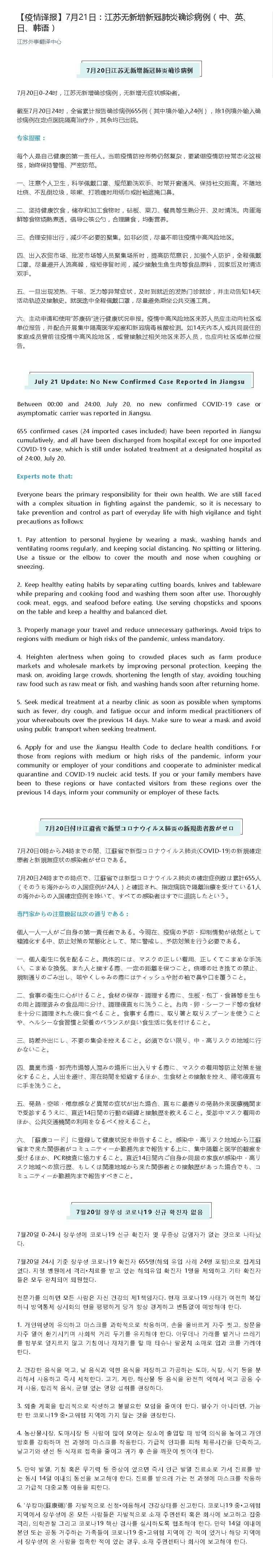 July 21 Update: No New Confirmed Case Reported in Jiangsu