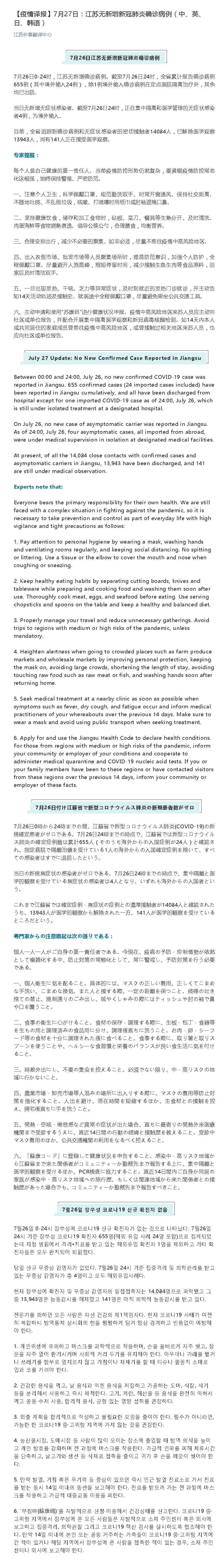 July 27 Update: No New Confirmed Case Reported in Jiangsu