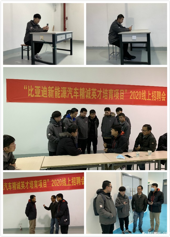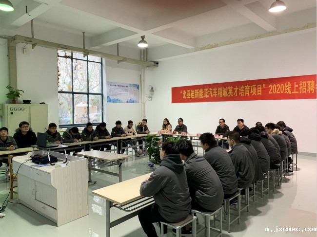 2020年9月,“比亚迪新能源汽车精诚英才培育项目”2020年线上招聘会在工业中心G4-101顺利举办,受疫情影响,本次招聘会采用线上视频方式进行,中车云商市场部总监张可和市场部经理舒畅亲临招聘会现场指导。来自上海、南京、南通、盐城等地的13家比亚迪服务商代表和21名比亚迪班同学参加了此次线上招聘会,此次招聘会为学生提供了钣金、机电维修、仓库管理、市场经理服务顾问等30多个优质岗位。