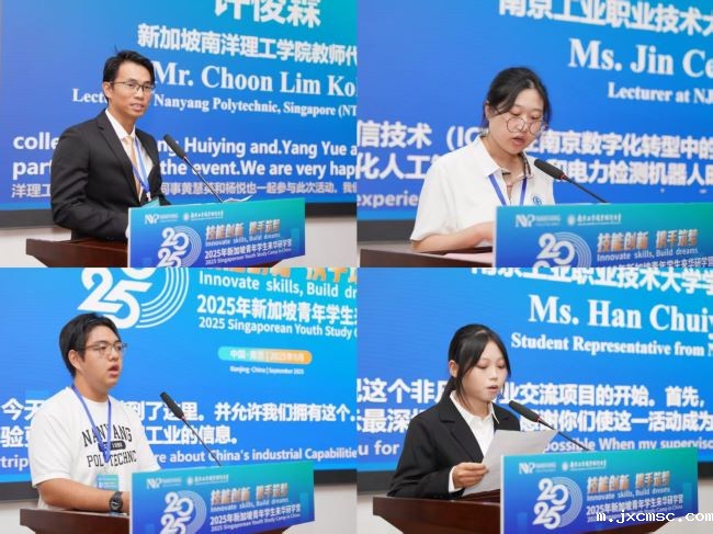 中新双方师生代表一致认为,本次研习营为青年学生提供了宝贵的交流与学习机会,不仅拓宽了视野,也增进了友谊与理解。来自新加坡南洋理工学院的吴凡同学在发言中表示,这是他第一次深入体验南京的校园生活与城市文化,古老与现代交织的独特氛围给他留下了深刻印象。通过参加研学营的课程学习与企业参观,他对中国在智能制造和信息通信等领域的创新成就有了更直观的认识,并对未来中新在职业教育与科技产业上的合作充满期待。他希望两国青年能在交流中建立真挚情谊,携手探索更多合作与发展的可能。中方教师代表金岑芩表示,希望同学们通过师生交流、企业参观,多角度全方位理解传统与当代中国,收获美好回忆。中方学生代表韩垂宇表示,希望新加坡同学能够更多地了解中国的文化与发展。